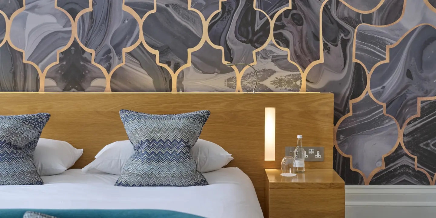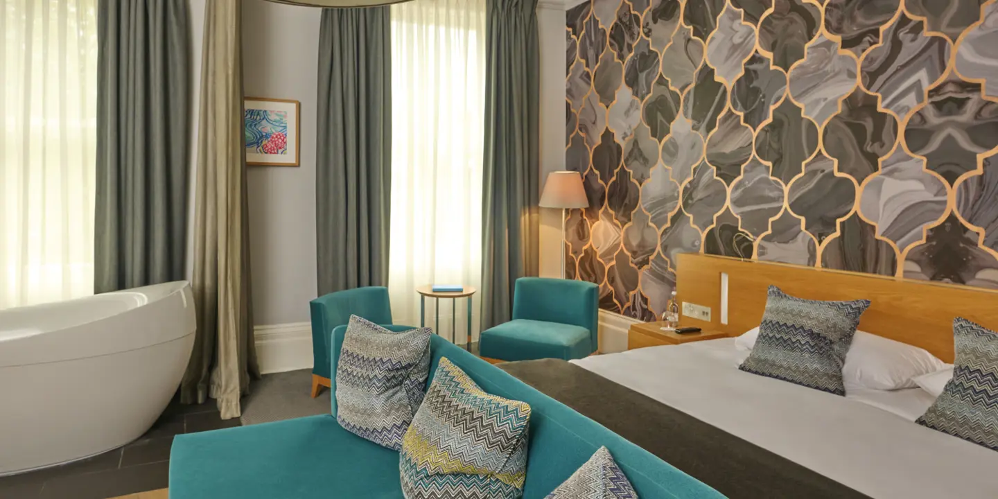 Luxurious large bedrooms with super king bed, featuring an open freestanding bath in the main room, and a separate en-suite containing a toilet and rainfall shower.